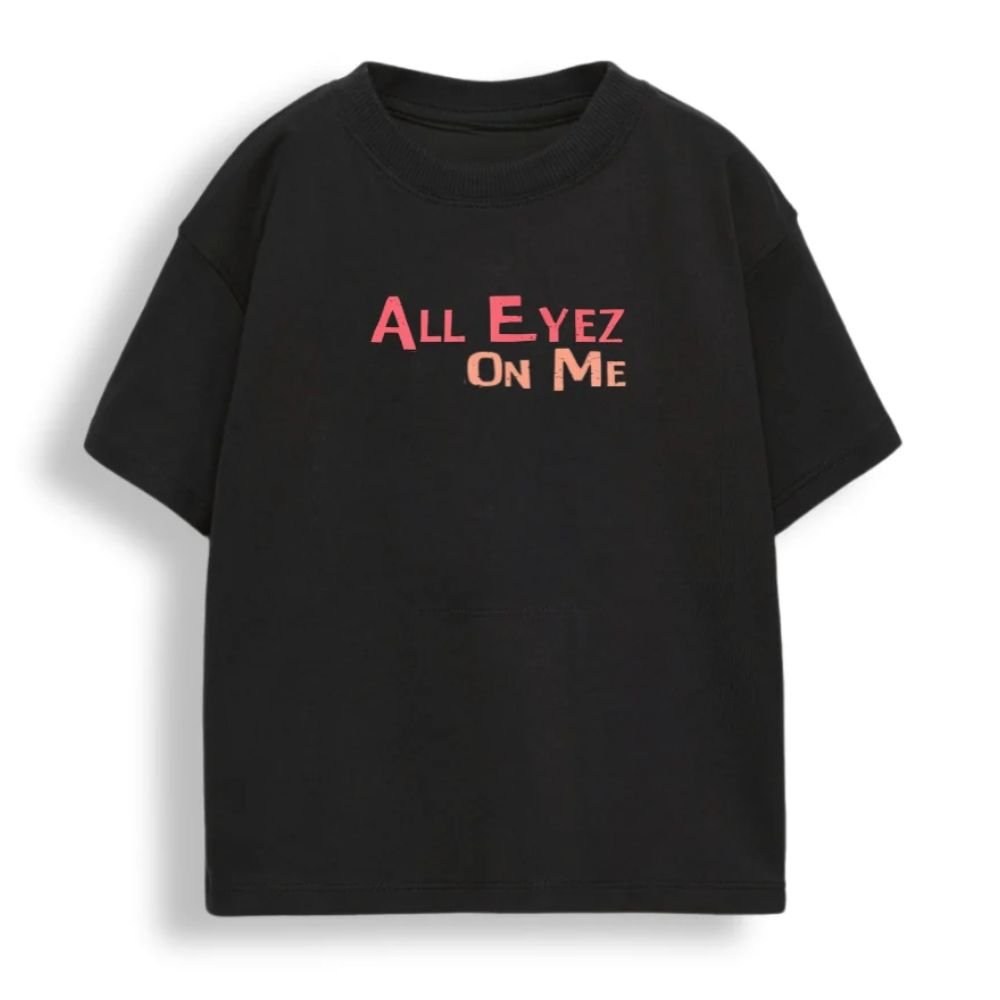 Bold Title Typography: The phrase “ALL EYEZ ON ME” is rendered in a sharp, salmon-pink sans-serif font across both the front chest and the back graphic.