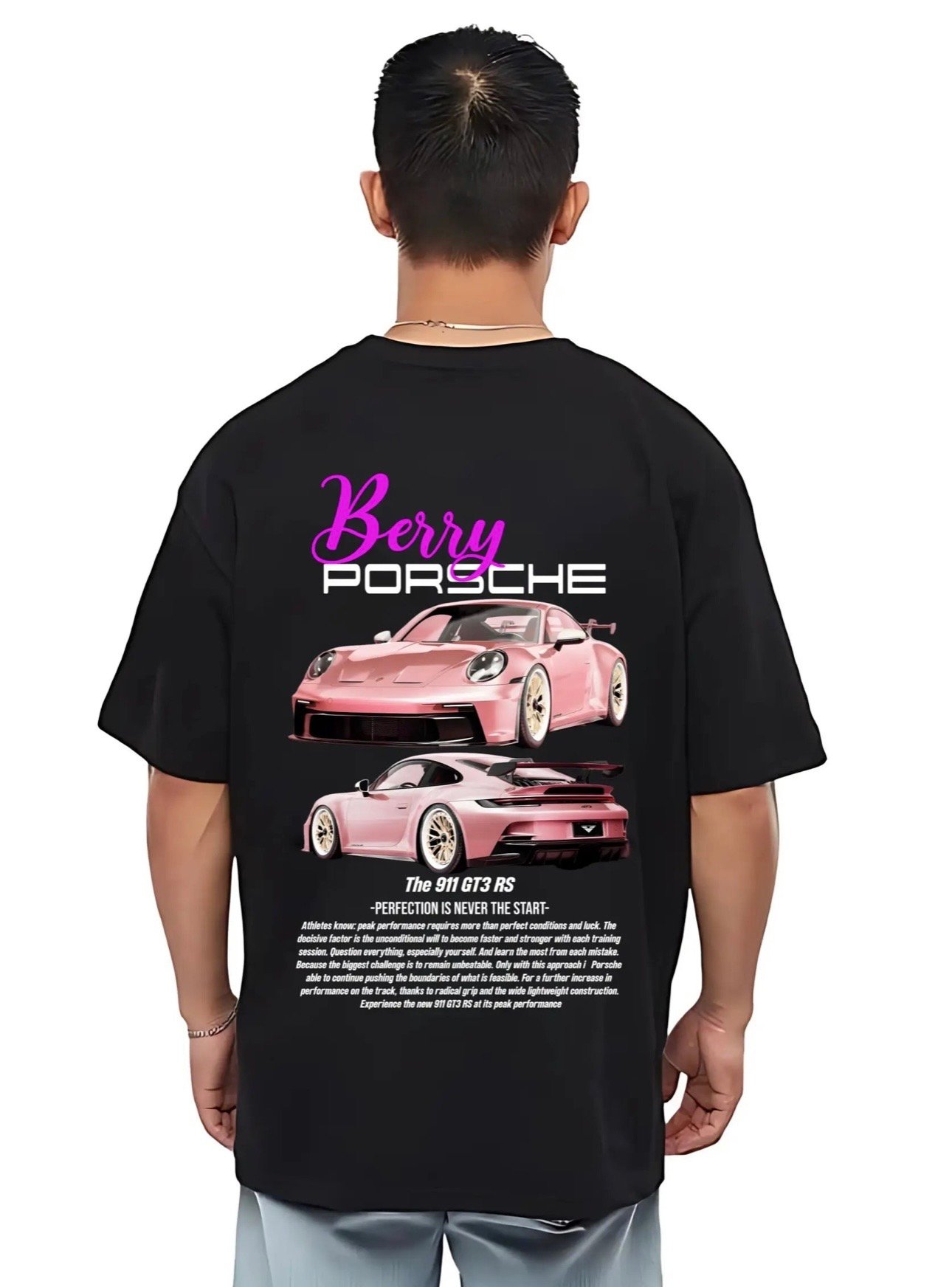 The Vibe “Perfection is never the start”—it’s a journey. This tee celebrates the legendary Porsche 911 GT3 RS, a car built for those who question everything and push the boundaries of what is feasible. With its striking pink “Berry” aesthetic against a deep black canvas, this design captures the grip, lightweight construction, and raw power of the track for your everyday wardrobe.