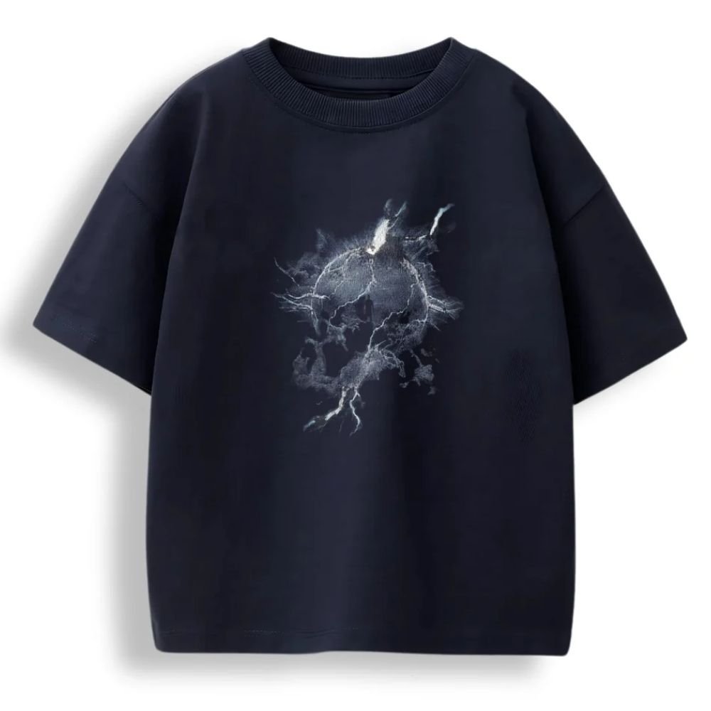 The Vibe Channel the raw power of the universe with the Cosmic Fracture Oversized Tee. This design features a striking, central graphic of a celestial body or globe shattering under the force of ethereal energy and lightning strikes. Set against a deep navy canvas, the intricate white and grey details create a high-contrast, atmospheric look that perfectly blends sci-fi elements with modern streetwear.