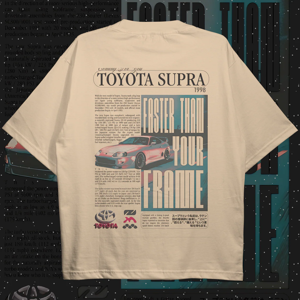 “Chassis-Blueprint” Illustration: Features a high-contrast back-print of the Supra A80 rendered in “Vector-Wireframe,” highlighting the active spoiler mechanics and the legendary “Ring-Light” tail lamp geometry.